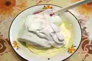 1. Первым делом желтки отделяем от белков. Белки перекладываем в глубокую сухую миску и обязательно отправляем охлаждаться в холодильник. В емкость с творогом добавляем желтки, ванильный сахар, сметану, крахмал, и взбиваем все блендером до получения однородной воздушной массы.