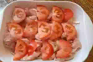 4. Помидоры нарезать кружочками или полукружочками. Накрыть ими мясо.