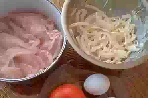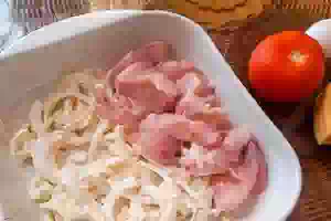 1. Сначала надо подготовить репчатый лук. Луковицу очистить, разрезать пополам и нарезать полукольцами толщиной около 5 мм. Положить нарезанный лук на сито, ошпарить кипятком и дать воде стечь. Переложить лук в миску, добавить майонез, перемешать. Оставить лук мариноваться в майонезе, пока подготавливаете остальные продукты для запеканки. Пока маринуется лук, куриное филе промыть под проточной холодной водой, обсушить на бумажном полотенце. Каждое филе нарезать ломтиками поперек волокон. Каждый ломтик можно дополнительно слегка отбить.