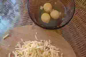 2. Из яиц и тертого сыра приготовить заливку для запеканки. Для этого достаточно смешать венчиком яйца с тертым сыром. Примерно 2-3 ст.л. тертого сыра отложить для посыпки запеканки.