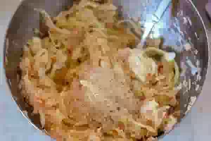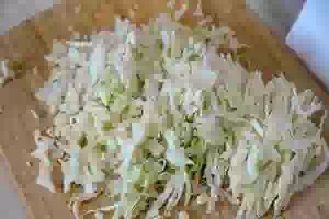 1. Капусту тонко нашинковать, сложить в миску. Если капуста молодая, то оставьте её как есть. Обычную капусту лучше немного обмять руками, чтобы она дала сок. После такой обработки она лучше пропечется в духовке.
