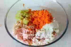2. В другой миске смешать мясной фарш, измельченные на терке или пропущенные через мясорубку морковь и лук. Я еще добавила сладкий перец. Фарш может быть любой, лучше смешанный из свинины с говядиной. Берите готовый фарш, если вам так удобнее, или пропустите через мясорубку со средней решеткой кусочки мяса с жирком.