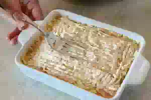 6. Огнеупорную форму смазать сливочным маслом, посыпать 1-2 ст.л. панировочных сухарей. Выложить запеканку и разровнять верх.