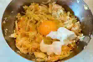 1. Капусту тонко нашинковать, сложить в миску. Если капуста молодая, то оставьте её как есть. Обычную капусту лучше немного обмять руками, чтобы она дала сок. После такой обработки она лучше пропечется в духовке.