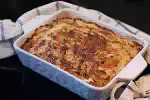 6. Огнеупорную форму смазать сливочным маслом, посыпать 1-2 ст.л. панировочных сухарей. Выложить запеканку и разровнять верх.