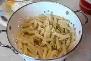 1. Вскипятить воду, посолить и засыпать макароны. Проварить примерно 8 минут до состояния аль денте («на зубок»). Слить с макарон воду и откинуть на дуршлаг.