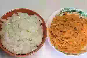 1. Рис тщательно промыть в холодной воде, засыпать в кастрюлю, залить холодной водой. Соотношение воды и риса 2:1. Посолить, довести до кипения. Уменьшить огонь до минимума и варить в подсоленной воде примерно 10 минут. Лук очистить и мелко нарезать. Очищенную морковь натереть на крупной терке.