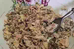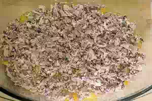 4. Из банки с консервированной рыбой слить жидкость. Кусочки рыбы размять вилкой и разложить поверх овощного слоя.