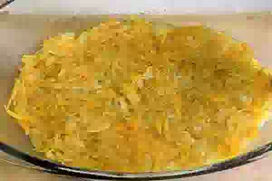 2. В сковороде разогреть 2 ст.л. растительного масла и обжарить лук до прозрачности. Затем добавить к луку тёрку морковь. Продолжать готовить овощи до мягкости, добавив немного черного молотого перца или других приправ на свой вкус. Смазать огнеупорную форму растительным маслом и выложить половину риса.