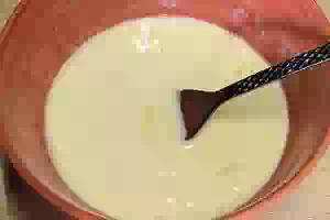 6. Для заливки яйцо со сметано взбить вилкой, посолить. Сметану можно заменить молоком.
