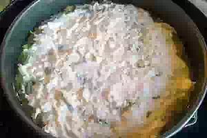 6. Тут рука дрогнула. Добавила вовнутрь две ложки растительного масла, а сверху беспорядочно разбросала натертый сыр в сметане. Положила в форму.