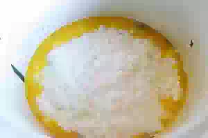5. Белки взбила с солью и добавила в смесь.