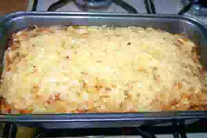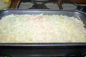 1. В отваренный рис добавляем два сырых яйца (у меня домашние, потому такой яркий желток) и выкладываем толстый слой риса в смазанную форму.