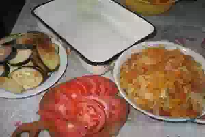 2. Баклажаны порежем кружочками, посолим и дадим им постоять полчаса. Потом сольем сок, обваляем в муке (необязательно) и обжарим на масле. Пассируем на масле лук с морковкой, добавляем к ним капусту с перцем, солим и перчим. Тушим, чтобы капуста стала мягкой и уменьшилась в объеме. Добавляем томатную пасту и тушим еще 5 минут. Помидоры режем кружочками. Из яиц, сметаны, 2 ст. ложек муки готовим соус, солим его и перчим, можем добавить любимые специи.