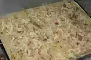 4. Потом половину капусты с перцем и трем сверху сыр. Поливаем половиной соуса и снова выкладываем баклажаны.