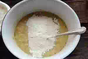 Перемешать сухие ингредиенты: муку, сахар и разрыхлитель.