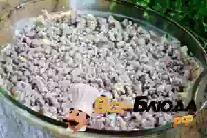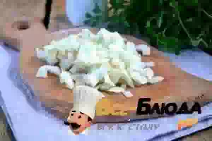 4. Обжарьте лук в небольшом количестве подсолнечного масла. Добавьте фарш. Посолите и жарьте, часто помешивая, до готовности.