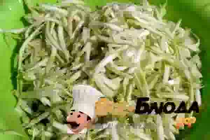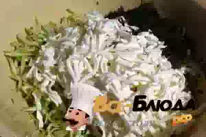 2. К кабачку добавить рубленную зелень, сыр фетаксу натереть на крупной тёрке. Если используете фета, то просто раскрошите её, или слегка разотрите вилкой. И зубчики чеснока через мелкую тёрку.